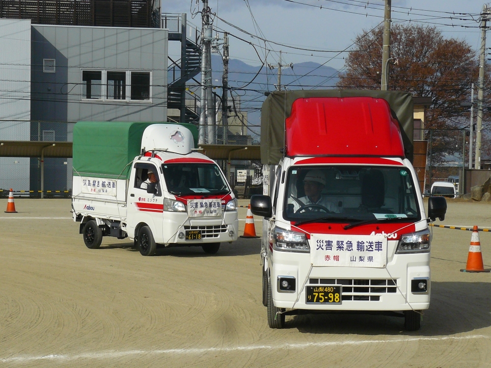 赤帽山梨県はトラック協会と連携し、山梨県警の白バイ先導のもと、避難所へ物資を届ける物資輸送訓練を行いました。